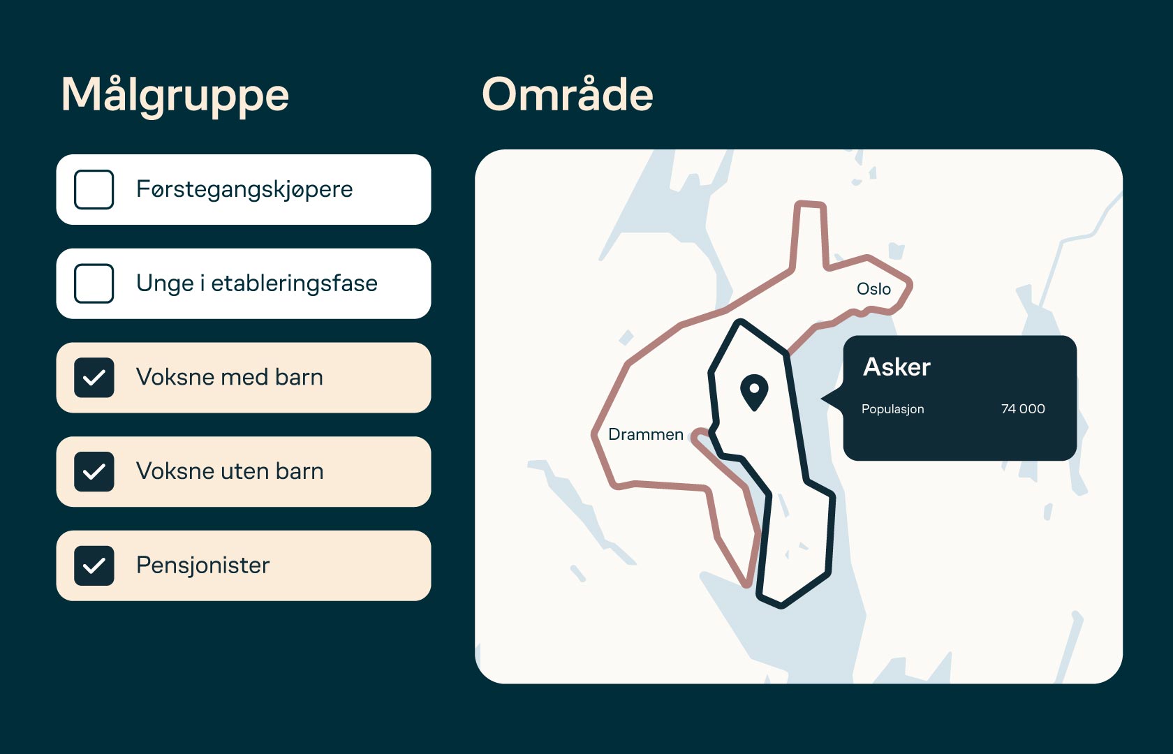 - Velg målgruppe, fase, mål og område. Inne i annonseringsverktøyet bestemmer du hvem du ønsker å nå, hvilken fase prosjektet er i, hva du ønsker å oppnå med annonseringen, og hvor i landet du ønsker å være synlig. Er du i tvil om hva du bør velge, får du anbefalinger av oss.